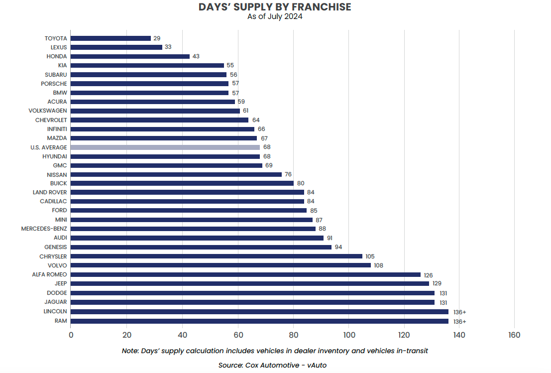 Average days’ supply as of July 2024 was about 68 days, or a little over two months, which is back to pre-COVID levels. But if you talk to a Toyota dealer and a CDJR dealer, you’ll question whether they are even operating in the same industry with the difference in the tenor of the conversation. Toyota appears to have gotten its EV/hybrid strategy “right” by not forcing loss-producing EVs before the market was ready to accept them. CDJR is suffering from a different problem; they’ve overproduced, and their vehicles saw much greater increases in price than their peers. The net result is that consumers vote with their wallets and buy other vehicles.