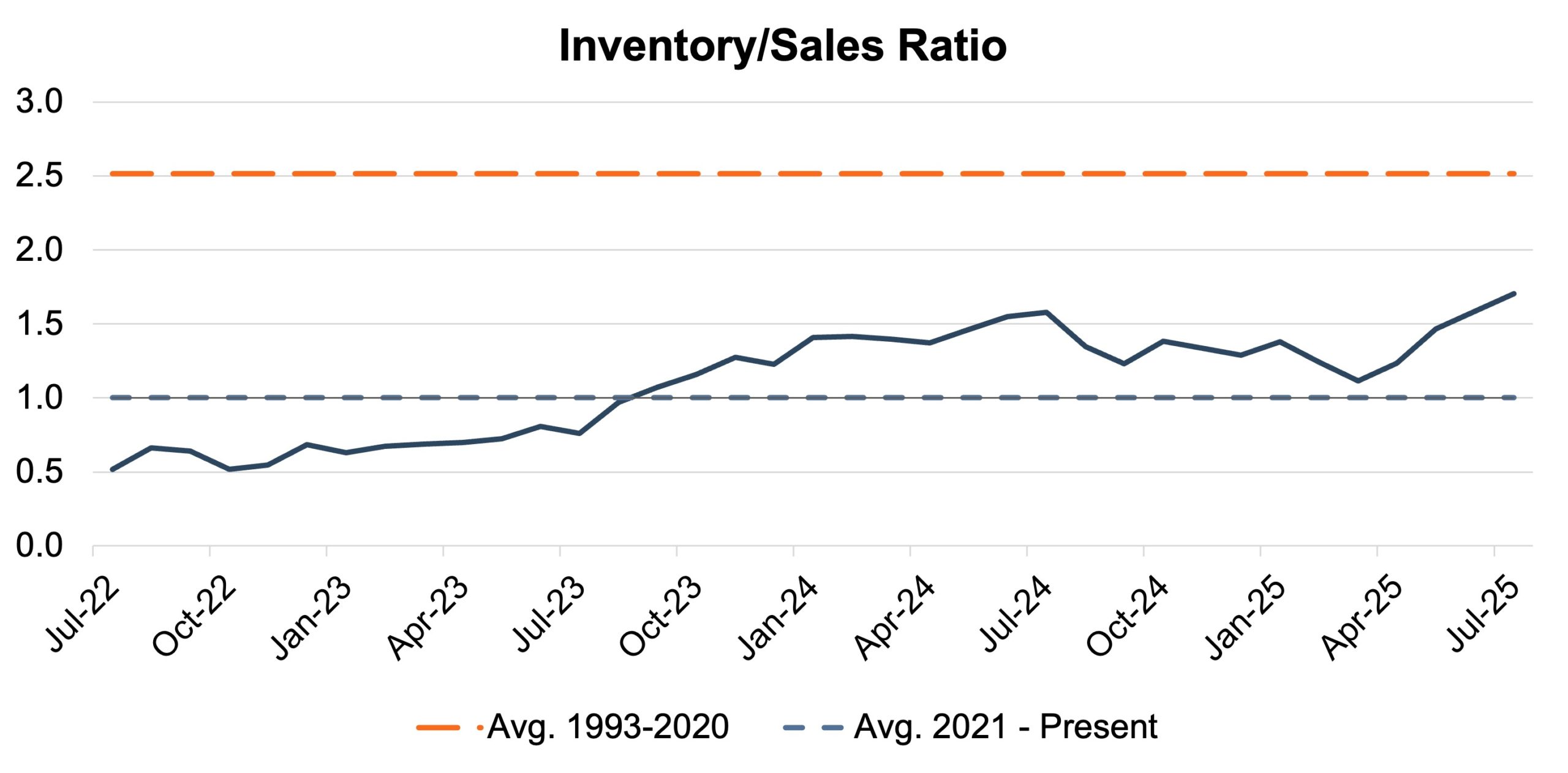 In August 2025, the auto industry's inventory-to-sales ratio climbed to 1.70x from 1.59x in July, the highest since February 2021 (pre-chip shortage). Looking forward, we expect the ratio to hold above 1.0x, driven by the introduction of pricier inventory and pressure on consumer purchasing power. However, we find it unlikely that the industry fully reverts to pre-2020 averages. The chart below presents the industry’s inventory-to-sales ratio over the last three years.