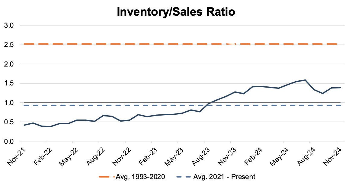 The industry’s inventory-to-sales ratio held steady in November 2024, coming in at 1.39x compared to 1.38x in October. Following major industry disruptions throughout the last several years, the November metric reflects the continued stability of the supply and demand dynamic in the market. The chart below illustrates the industry’s inventory-to-sales ratio over the last three years. We notice that while inventories have been rebuilt, they are well below pre-COVID levels when compared to sales activity.