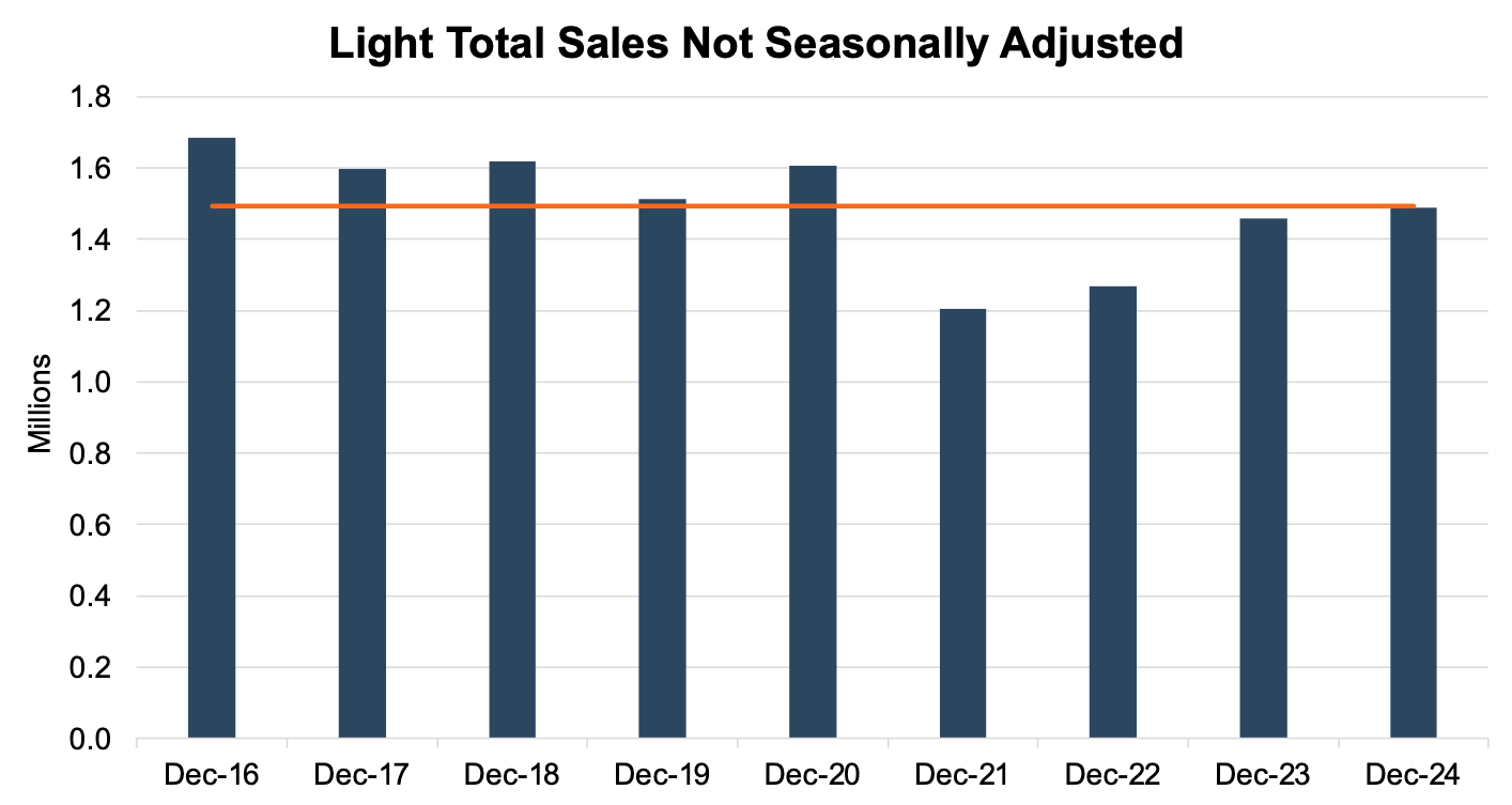 On an unadjusted basis, the industry sold 1.48 million units during December 2024, an 8.4% increase from last month and a 2.0% increase from this time last year. This month’s unadjusted sales landed four thousand units shy of the nine-year December average of 1.493 million units (2016 – 2024), emphasizing that this December’s sales volumes may be higher than recent years but remain below the pre-pandemic levels. During 2024, we have seen this trend play out almost every month as unadjusted monthly sales creep closer to their respective nine-year averages. See the chart below for a look at unadjusted sales over the last nine Decembers.