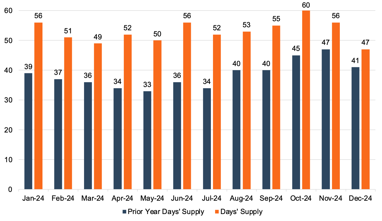 Days’ supply came in at 47 days in December 2024. Throughout 2024, inventory levels suggest that the global supply chain has largely rebounded from the lows of the Covid-19 pandemic. Generally, the rebound of inventory levels over the last several months has driven sales increases as consumers are able to access a wider, more affordable inventory base. It is important to note that inventory levels vary significantly from brand to brand. The chart below presents days’ supply for U.S. light vehicles over the past 24 months (per Wards Intelligence). While December 2024 was still greater than 2023, we note a decline from the recent peak of 60 days in October 2024, ending the year at a low.