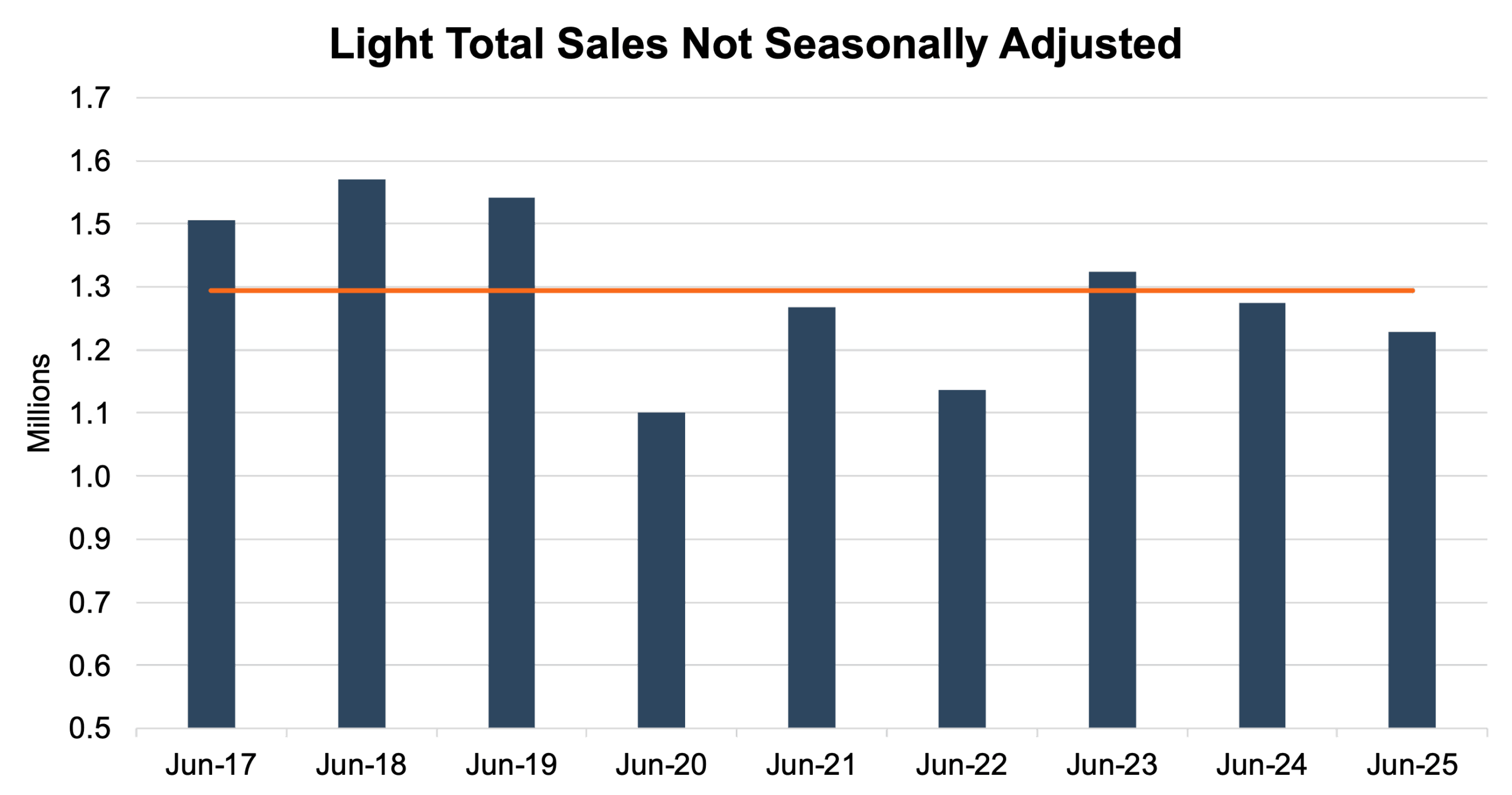 On an unadjusted basis, June 2025 industry sales finished at 1.25 million units, a 14.2% decrease from last month and a 4.2% decrease from June 2024. This can be partially attributed to two fewer selling days compared to June 2024, as well as the affordability factors discussed previously in this blog. This month’s unadjusted sales fell short of the nine-year June average of 1.33 million units (2017 – 2025) by approximately 79 thousand units. See the chart below for a look at unadjusted sales over the last nine Junes.