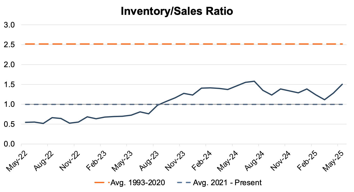 The industry’s inventory-to-sales ratio increased to 1.50x in May 2025 from 1.28x in April 2025. In the coming months, we expect the ratio to remain above 1.0x due to a slower sales pace across the country once higher-priced inventory starts hitting lots. The chart below presents the industry’s inventory-to-sales ratio over the last three years.