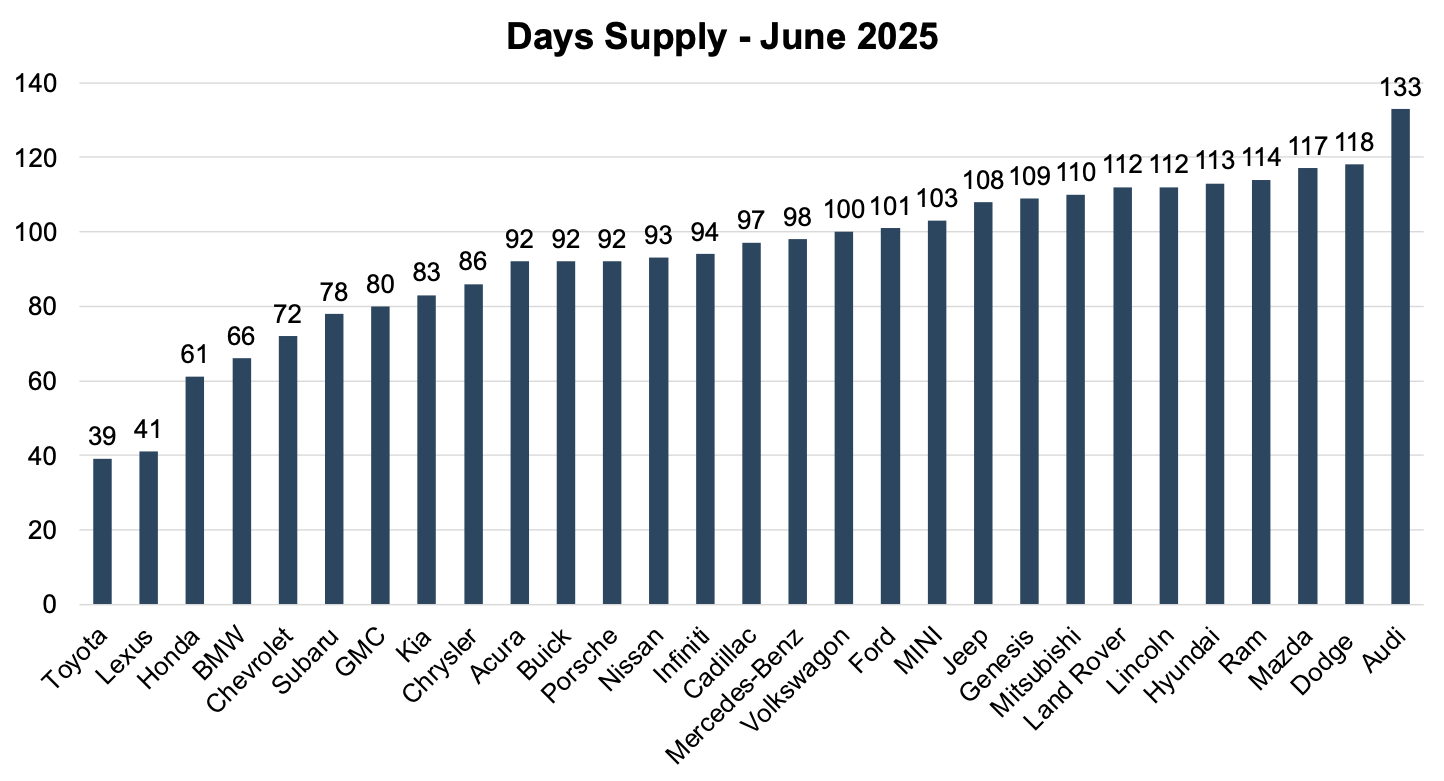 Toyota (39 days) and Lexus (41 days) continue to stand out for their disciplined approach to inventory management. These low days’ supply levels reflect faster retail turnover and tighter alignment between shipments and consumer demand. In contrast, brands like Audi (133 days), Dodge (118), Mazda (117), and Ram (114) are sitting on much higher levels of inventory. Whether due to sluggish demand, aggressive production targets, or weak incentives, these elevated days’ supply figures can be a drag on dealership performance. As the market remains in flux and tariffs loom in the background, how each OEM manages inventory is becoming a key differentiator. For dealers and investors, evaluating franchise value in the current environment requires a closer examination of how well a brand is supporting operational health.