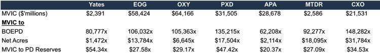- The attractive upside for Yates is not in the current production, but in the undeveloped acreage, possibly adjacent to EOG acreage (explains the low MVIC to BOEPD metric);