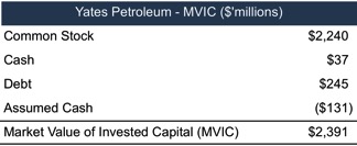 - Financial Statements. It would also be helpful to understand more about Yate’s decision to sell, and perhaps, the financial situation immediately prior to the sale. What we know is approximately 48% of the current production is oil which leaves 52% of the production as either natural gas or natural gas liquids. This leads us to ask: is Yates an example of oil prices exposing a struggling natural gas company? Yates had $245 million in debt, and $114 million in net debt. Based upon our calculated $2.3 billion MVIC indication, debt is approximately 4.85% of the capital structure. While this is just a guess on our part, this doesn’t indicate a financially stressed company. It does make us question their ability to obtain additional financing for new wells.