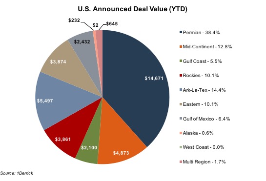 Last week, we looked at the recent transition of E&P companies out of the Bakken and the Eagle Ford to the Permian. We concluded that E&P companies are moving to the Permian for its (1) upside potential, (2) low break even prices, and (3) diversity of resources. This week M&A activity reinforced this idea. In the last week, there were 18 E&P deals in the U.S.1 Seven of those transactions were in the Permian and over half of the total deal value generated ($768 million in total) from September 30 to October 6 was in the Permian. Today we focus on two transactions: Resolute Energy’s acquisition of Delaware Basin Acreage and Apollo and Post Oak Energy’s merger to form Double Eagle Energy Permian. Before we drill down the details of these transactions, here’s a breakdown of total announced deal value generated in the U.S. this year.
