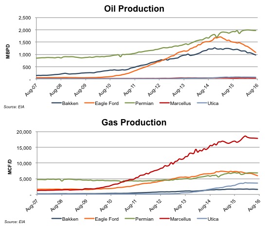 The Permian is the largest producer of oil and the second largest producer of gas, after the Marcellus. Even as gas prices collapsed, production in the Permian increased. Companies that operate in the Permian do not have to choose between oil and gas, but can diversify operations. The market for commodities is inherently risky because producers are price takers. Although related, the price of natural gas and crude oil are not perfectly correlated. Thus when the price of natural gas fell six years ago, producers in the Marcellus and Utica were entirely exposed to the natural gas market, while producers in the Permian were able to rely on their profits from crude oil to fund operations.