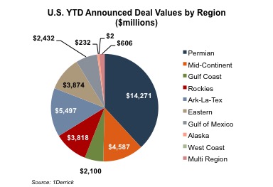The majority of these transactions have occurred in the Permian. This year, 38% of total E&P deal value was generated from deals in the Permian, and 24% of the number of total deals occurred in the Permian.1 This demonstrates that more deals and larger deals are happening in the Permian than in other plays in the U.S.