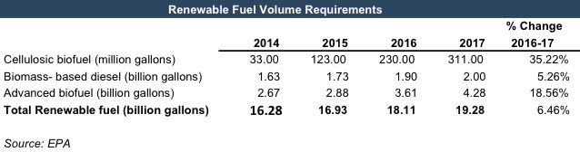 The Renewable Fuel Standards (RFS) program, which originated from the Energy Policy act of 2005, set a goal to use 36 billion gallons of renewable fuels by 2022. RFS was signed into law by President George W. Bush in order to reduce greenhouse gas emissions and boost rural farm economies. Each November, the EPA issues rules increasing Renewable Fuel Volume Targets for the next year. The following table shows the Renewable Fuel Volume requirements for the past three years and the targets for 2017.