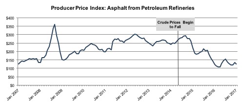 As the price of crude oil fell so did the price of asphalt sold by petroleum refineries. Crude oil prices fell by 50% from June 2014 to January 2017 (the most recent PPI data available for asphalt) while asphalt prices fell 55% over this same time period.