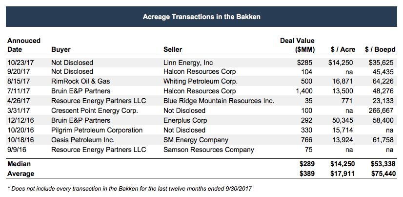 In addition Earthstone Energy, and more notably, Linn Energy exited the Bakken in the past several weeks. Linn entered the Bakken play in 2011 by buying out a position previously held primarily by Concho Energy for $434 million. They exited for $285 million which was approximately a 1.5x multiple of the PDP value of $186 million as of YE 2016. It appears that Linn struggled with maximizing its production profile in light of the major price shift in 2014. Earthstone Energy also left, with a small $27 million non-operating sale. They, too, are shifting their focus to the Permian Basin.