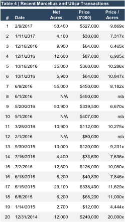 Based upon our experience in performing valuation services in the Appalachian play, the analysis above appears reasonable. Table 4 shows the previous 20 transactions in the area. Not all transactions could be broken down into producing and non-producing acres; therefore, it is shown as a total price to total net acres multiple. The EQT and Rice transaction shows as the most expensive price / acre transaction of the last 20 in the area.