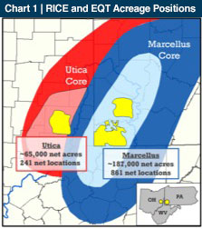 Based on EQT disclosures, the assets owned by RICE include (1) 255 wells currently producing 1,145 mmcfe per day (mmcfepd) which are expected to increase to 1,300 mmcfepd; (2) 252,000 in net Marcellus and Utica acres with more than 1,100 net locations remaining to explore; (3) 92% of RICE GP interest including the incentive distribution rights (IDR’s); and (4) 28% of Rice Midstream Partners (RMP). By all accounts, the location of the acreage is contiguous or nearby to EQT’s current acreage and the combination of the two companies will create the largest gas producer in the Marcellus and Utica.
