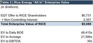 We have considered EQT’s offer to RICE shareholders, but RICE’s shareholders only own 28% of Rice Midstream and 92% of the GP interest. Due to the accounting rules for consolidation, the majority of the income statement and production figures capture activity for 100% ownership (the non-controlling interest is not taken out until the end). Therefore, by not including the non-controlling interest that is consolidated into Rice’s balance sheet, we previously compared less than 100% of the Company’s Enterprise Vale to 100% of the Company’s production, acreage, and EBITDA.