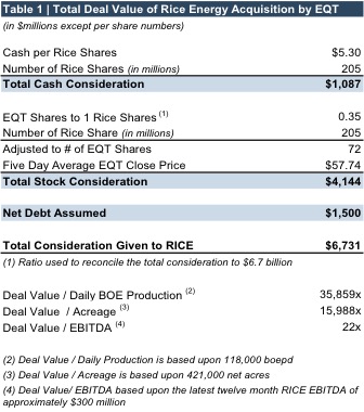 On June 19, 2017, EQT announced the acquisition of Rice Energy (RICE) for approximately $6.7 billion. RICE will receive approximately $4.1 billion in EQT common stock and $1.1 billion in cash as well as be relieved from $1.5 billion in net debt that EQT is assuming.
