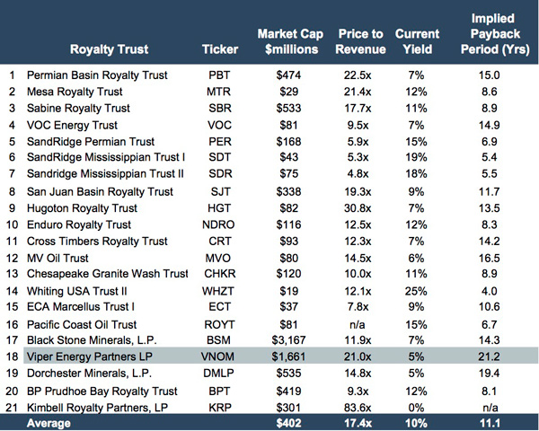 There are approximately 21 oil and gas focused royalty trusts and partnerships publicly traded, as of the date of this article. As demonstrated below, VNOM is unique from the other 20 similar entities.