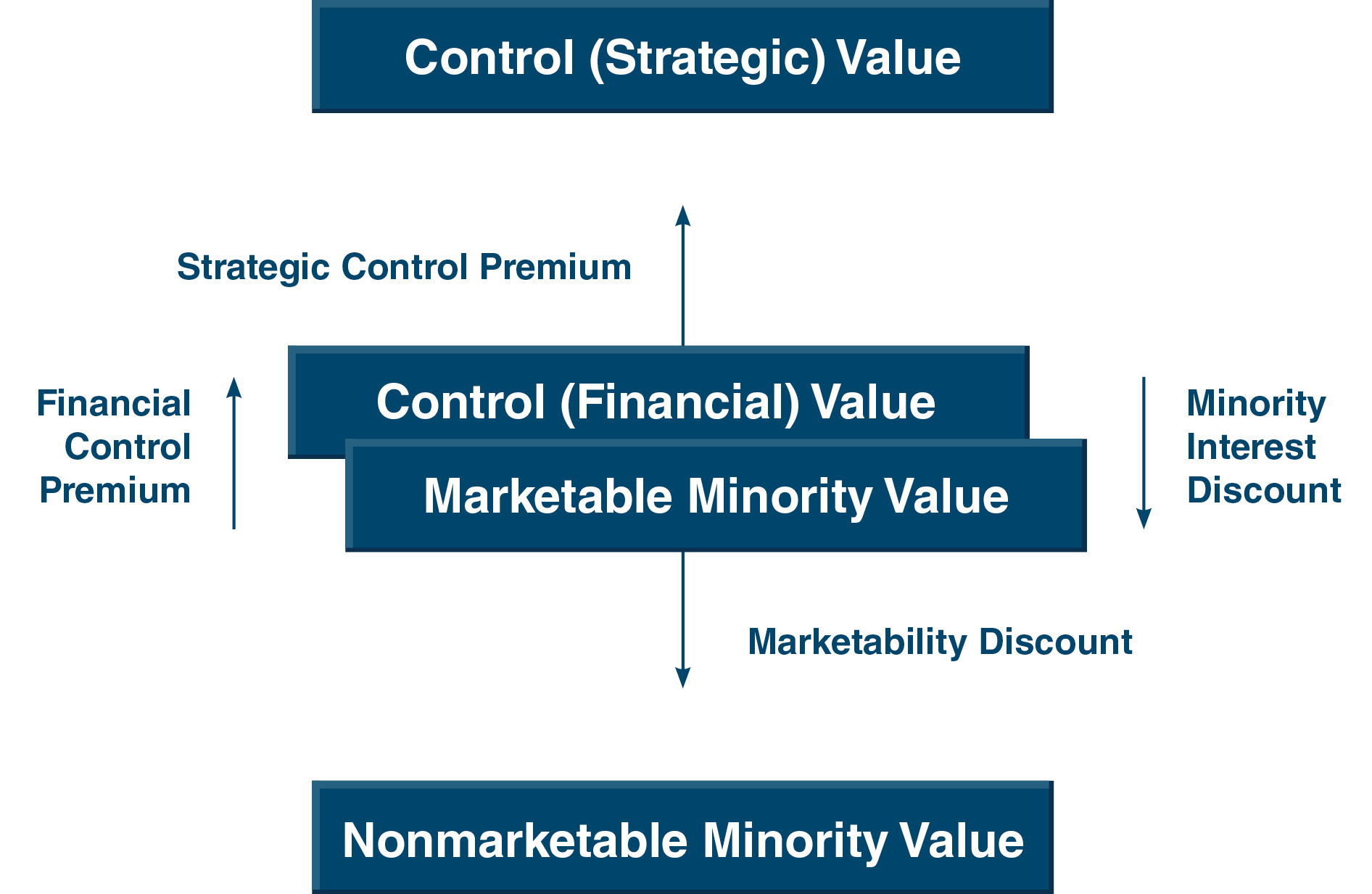 The benchmark level is the marketable minority level of value, or the middle level in the chart above. Conceptually, it represents the pricing of the equity of a public company with an active and freely trading market for its shares. For a private company, it represents that same price as if there were a free and active market for its shares. The lowest level on the traditional levels of value chart is called the nonmarketable minority level of value. This level represents the conceptual value of illiquid (i.e., nonmarketable) minority interests of private companies, or entities that lack active markets for their shares.