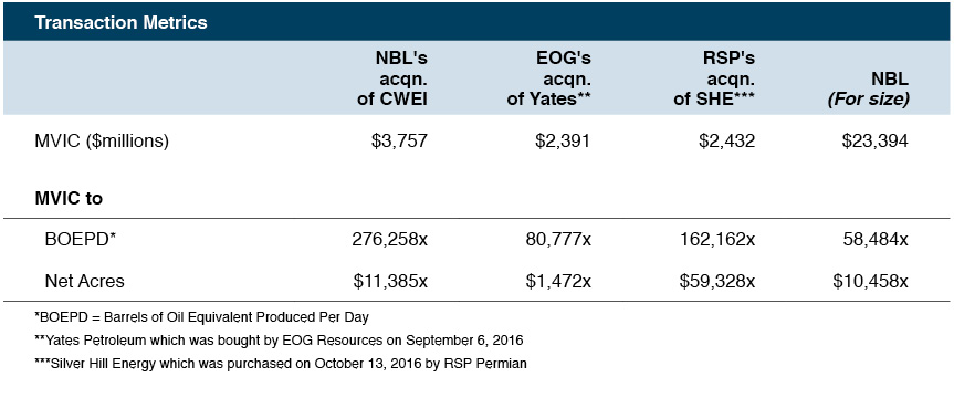 - While this acquisition appears to be priced high on the BOEPD metric, the significant amount of acreage acquired by NBL indicates a net acre multiple that is consistent with other transactions.