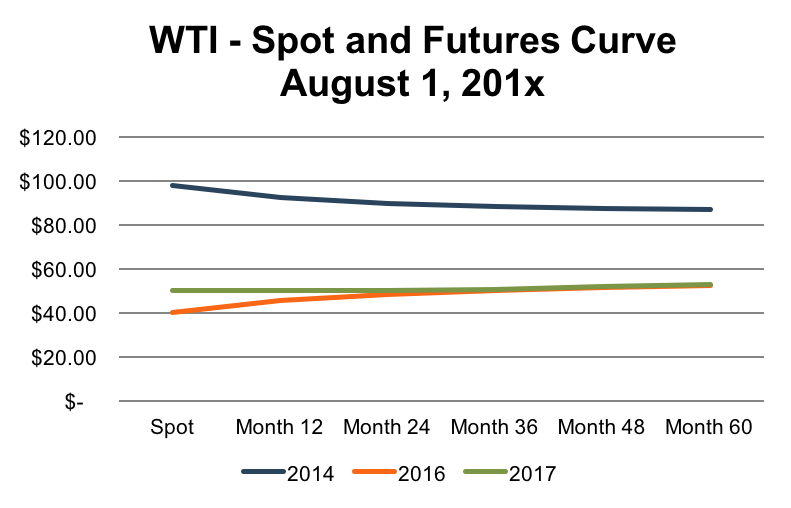 To break down the significant change over the previous three years, the chart below shows the 2014, 2016, and 2017 WTI futures curve for 24 months and the spread between Month 1 and Month 24. Positive spread indicates backwardation, while negative spread indicates contango.