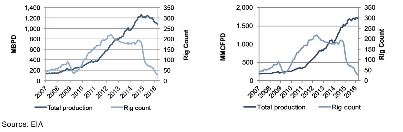 | 1 North Dakota Dept. of Mineral Reserves Sept. 2015 county-level estimates 2 Drilled Uncompleted Wells with > 3 months in inventory as of January 2016; also referred to as fraclog (Bloomberg Intelligence) 3 EIA as of June 2016 | |