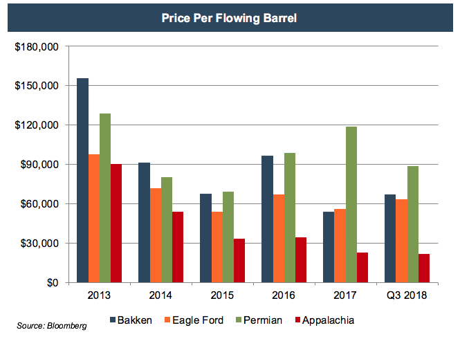 Before the crash in oil prices, the Bakken was booming with the highest EV/production multiples, also known as price per flowing barrel. The Permian took center stage in 2017, but the Bakken is closing that gap as the Permian has come back to the pack a bit in 2018.