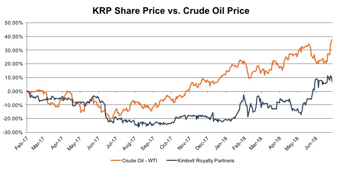 The youngest of the 21 partnerships, Kimbell Royalty Partners, LP (“Kimbell,” “KRP,” or the “Company”), went public in February 2017. The Company’s IPO opened at $18.00 per share, initially offering 5 million shares. Since going public, KRP’s price struggled in its infancy and fell under $16 per share in mid-August 2017. This year has been much kinder to Kimbell due to the high crude price with its share price peaking at $23. Approximately 70% of Kimbell’s revenues are from oil and natural gas liquids.
