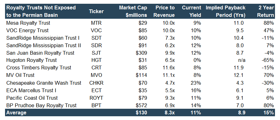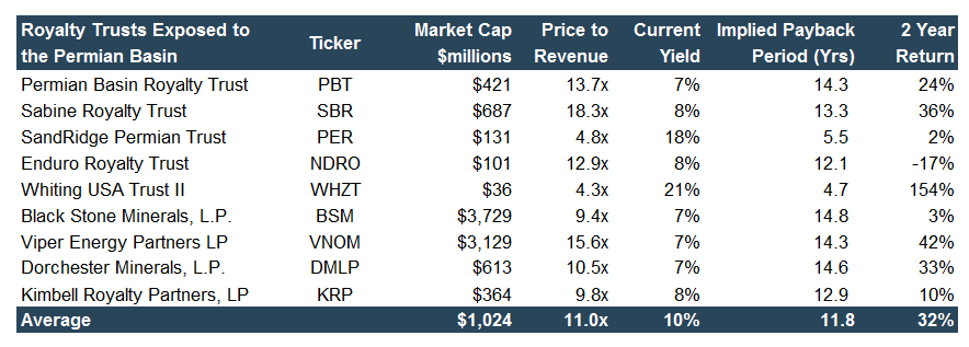 We can understand the valuation implications for companies in the Permian Basin by looking at 1) royalty trusts and mineral rights aggregators and 2) E&P companies.