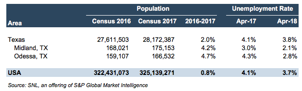With this rush to West Texas, Midland and Odessa are in the middle of the action. The boom has had a large impact on their economies as a whole. Population growth from 2016 to 2017 was estimated at 4.2% for Midland and 4.8% for Odessa, compared to 2.0% for Texas and 0.8% for the country. Unemployment was also extremely low at 2.1% and 2.8%, respectively, compared to 3.8% for the state and 3.7% for the country. The national unemployment rate is already at its lowest of this millennium, emphasizing how razor-thin the margin is in Midland. This has caused significant labor shortages in other sectors of the economy as they cannot compete with $28/hour wages offered after minimal training requirements for workers in the oil sector.