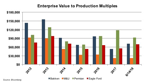 As seen in the graph below, E&P companies valuation multiples on average remain highest in the Permian, but they have declined 21% in 2018. Multiples in the Bakken and Eagle Ford meanwhile have cut into the gap, increasing 34% and 25%, respectively since the beginning of the year. The Marcellus and Utica continue to see the lowest valuation multiples and have declined by 2% in 2018. Companies in the Permian are generally more profitable than companies in other regions as explained by their lower break-even prices. According to Bloomberg Intelligence, recent break-even prices in the Permian were $38 in both the Delaware and Midland Basins.3 This represents a 6% decline for the Delaware Basin since June 2017, compared to a 28% decline in break-even price for the Midland Basin. These break-even prices compare favorably to $40 in the Bakken and about $44 in the Eagle Ford.