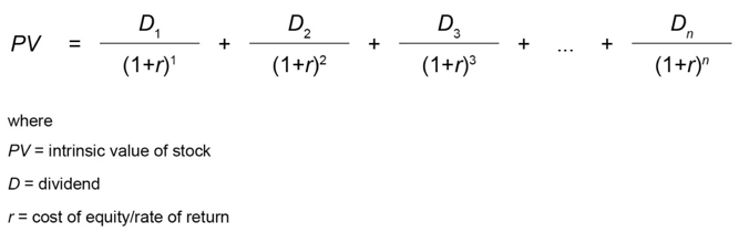 According to the dividend discount model, the intrinsic value of a stock is the expected value of future dividends, discounted back to the present at an appropriate discount rate. Forecasts of dividends are typically estimated for anywhere between 3-15 years, or until a time where future dividends will grow/decline at a stable rate. At this point, a terminal value is added, which accounts for all remaining value after earnings have stabilized, which is discounted back to the present.