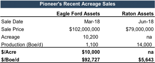 In March 2018, Pioneer sold its assets in the Eagle Ford for $10,000/acre and $92,727 per flowing barrel. The price Pioneer received was in line, or even above, industry averages which are more along the line of $4,200/acre and $98,000 per flowing barrel.