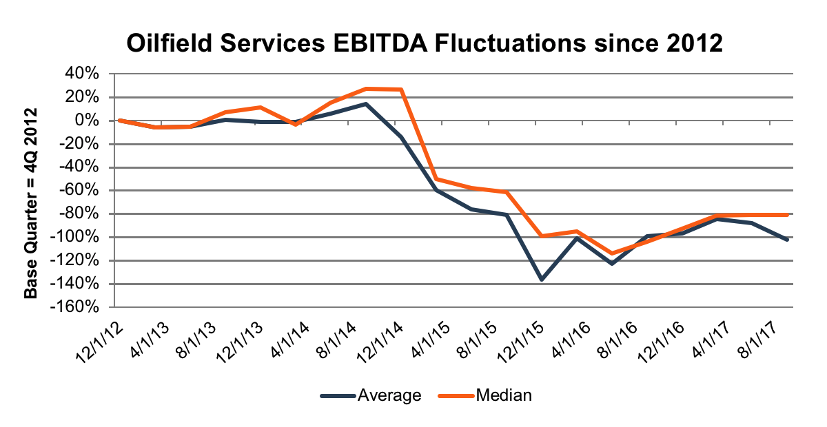 Although earnings in the E&P sector have improved over the last year, earnings in the oilfield service industry have taken a beating over the last few years. Three of the top four players had negative LTM EBITDAs until mid-year 2017.