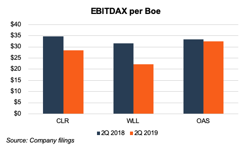 Continental, Whiting, and Oasis all unperformed the broader E&P index during the past year, with Whiting down a notable 85%. Oasis is funding its Permian development program with cash flows generated from its Bakken position, a strategy that has fallen out of favor with investors who now seek capital discipline and free cash flow generation. Whiting is down largely on concerns regarding leverage and inventory life. All three saw margin compression, with Whiting’s EBITDAX per boe down nearly 30% year-over-year.