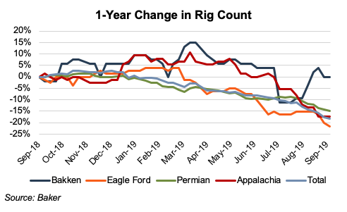 The rig count in the Bakken at the end of September was unchanged from the year prior at 53. While not impressive at first glance, the total U.S. rig count declined nearly 20% over the same period. Eagle Ford, Permian, and Appalachia rig counts declined 22%, 15%, and 17%, respectively.