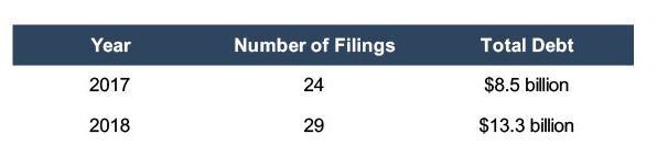 However, at the same time, a number of public companies made announcements of significant reductions in their 2019 exploration and production budgets. This could lead to an increase in filings for remaining producers who may have tighter cash positions in the event of capex and budgetary strains.