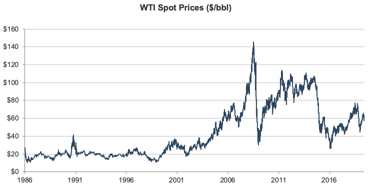 In applying the DCF method, the starting point is, of course, the development of a forecast of future cash flow for the subject company, which typically begins with a forecast of future revenues. Here we run into the first of several challenges in the appraisal of OFS companies. The OFS industry is of the most cyclical of industries that analysts can cover. Not just cyclical with the general economy of the region, nation or world, but cyclical in a way that is much more difficult to predict fluctuations in the price of oil (or natural gas) tied to a whole host of factors including technological, political, and even geopolitical factors can make forecasting complicated very quickly.