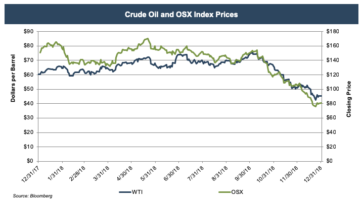 However, reports of increased global supplies, including from countries such as Saudi Arabia, Russia, and the U.S. resulted in prices falling again. WTI experienced a 44% decline from a 2018 high of $75 per barrel to lows of around $43 in late December. The OSX, the index tracking OFS sector stock performance, was sideways for the most of 2018 and fell in tandem with the fourth quarter oil crash, resulting in an all-time low for the index of $80.