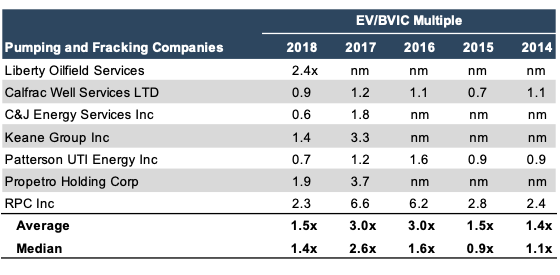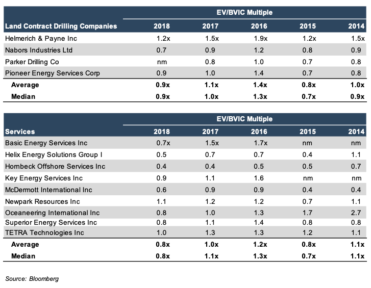 EV/BVIC multiples have fallen since the middle of the year and even below observed 2017 levels. Investors were not expecting to receive adequate return on capital deployed at these companies. After analyzing our guideline companies for oilfield services and equipment overall, observed average and median multiples for 2018 were below 1.0x for 2018.