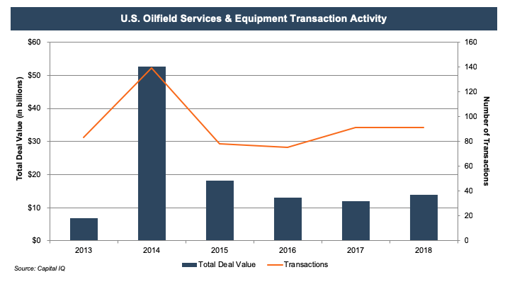 Transaction activity for the oilfield services sector for 2018 was near identical to 2017 in terms of number of deals, and total deal value saw a slight uptick. Low volatility and stable growth that defined 2017 markets and steadily increasing oil prices for most of 2018 have allowed for moderate transaction activity compared to the two years prior to 2017. This environment has also facilitated OFS companies to be more methodical in acquisitions compared to the past.