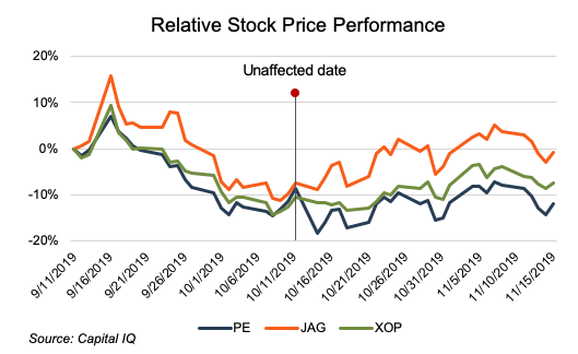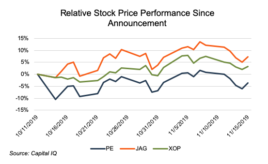 On October 14, 2019, Parsley (PE) announced that it was acquiring Jagged Peak (JAG) in an all-stock transaction valued at $2.27 billion. The market’s reaction to the announcement was generally negative, as Parsley closed down more than 10% on the date of the announcement. This appears to be driven, at least in part, by investors’ desire for Parsley to be acquired rather than be the acquirer.