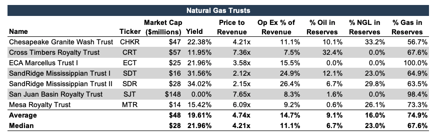 While these trusts are predominantly focused on natural gas, many also have oil and NGL reserves. These natural gas trusts have the lowest market caps and relatively high dividend yields. Compared to the crude oil trusts, these exhibit more diversity in product mix including notable amounts of NGLs.