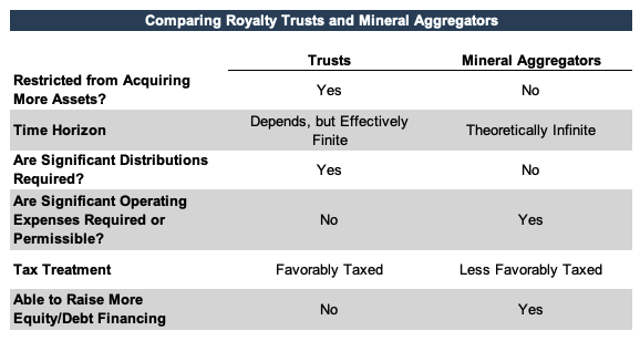 A table summarizing the primary differences between a royalty trust and a mineral aggregator is included below: