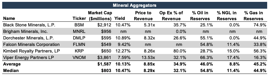 When compared to the trusts, aggregators are significantly larger in terms of market cap and have notably more operating expenses and product diversity. Also, they tend to trade at higher revenue multiples, with lower yields. While mineral aggregators may present an attractive option for investors, they are less functional as comparables for mineral interest owners. The lower yield, influenced by potential for return from future growth, and higher operating expenses render aggregators less comparable to traditional mineral interests.