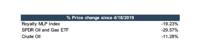 Energy commodity cycles can sometimes proffer interesting market dynamics. At various points, participants along the energy chain can benefit or suffer from the natural consequences of these changes. In the long run, commodity prices ultimately drive economics. Right now, exploration and production companies and oilfield service providers are grappling with austerity measures that investors are demanding. Most other upstream areas are struggling too; however, publicly-traded royalty and mineral aggregators are performing relatively better than their operating counterparts. While equity prices have dropped by approximately 30% for producers (according to SPDR Oil and Gas ETF), six publicly-traded royalty aggregators relatively outperformed the SPDR Index. These Royalty MLP’s (a bit of a misnomer as all are not partnerships) have tracked closer to crude oil prices, anchored by sizeable dividend payments, thus buoying sliding equity prices. If dividend yields are added back, some of them have been outperforming crude prices.