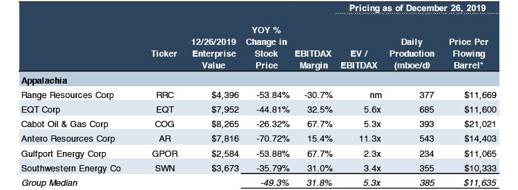 There’s no question that valuations are floundering at relative historic lows. Mercer Capital’s group of public Appalachian gas producers has dropped approximately 50% since last year. It’s the largest collective decline of any other publicly traded U.S. basin group. Of the publicly traded Appalachian-based gas producers, some are trading at the bottom of EBITDA multiple ranges, and nearly all trade at the bottom from a price per flowing barrel metric.