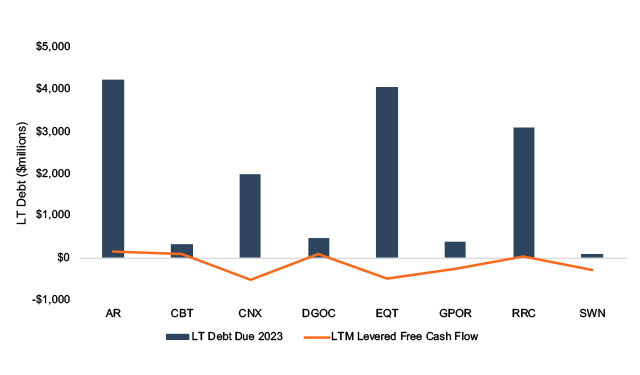 2020 Drop in CAPEX (millions) Source: Shale Experts[/caption] This strategy cuts both ways. It can conserve cash in the short-term to allocate towards debt repayment or share buybacks, but it can also hamstring growth and production in future years, compounding problems with languishing prices. This is top of mind for many producers as they grapple with how to keep investors happy and stay out of bankruptcy court. Some producers are better positioned than others in this aspect, particularly Cabot. The chart below shows the relationship between the total amount of debt principal due over the next five years as compared to trailing levered free cash flow. It shows that some companies have some real challenges in that area. [caption id="attachment_29437" align="alignnone" width="640"]