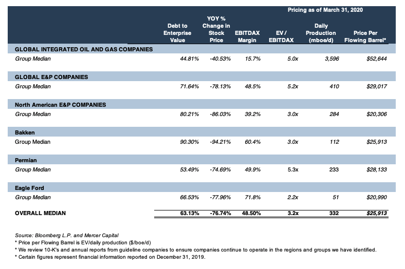 Implied valuations of public companies can provide a living proxy for market values, assuming efficient market theory. There are several metrics that investors and the industry utilize as potential benchmarks including cash flows such as EBITDA and EBITDAX. However, I note in this instance that the first quarter 2020 earnings have not been released yet, so trailing cash flow metric indications are not concurrent. Other metrics can be followed more contemporaneously such as enterprise value per flowing barrel of production. In addition, the drop in equity values push debt ratios higher, thus potentially triggering bank covenants.
