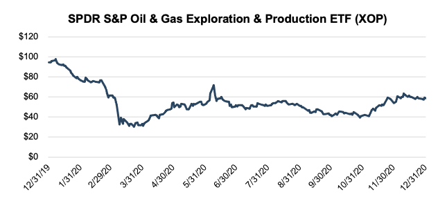 While E&P company values (as proxied by the SPDR S&P Oil & Gas Exploration & Production ETF) have recovered from their lows in March, the index remains down year-over-year, having declined 38% during 2020.