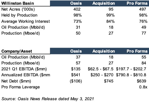 On May 3, 2021, Oasis Petroleum announced that it entered a definitive agreement to acquire select Williston Basin assets from Diamondback Energy in a cash transaction valued at approximately $745 million.  The effective date of the acquisition will be April 1, 2021, and the deal has yet to officially close.  The purchase consideration is expected to be financed by cash, revolver borrowings, and a bridge loan.  Transaction highlights include: